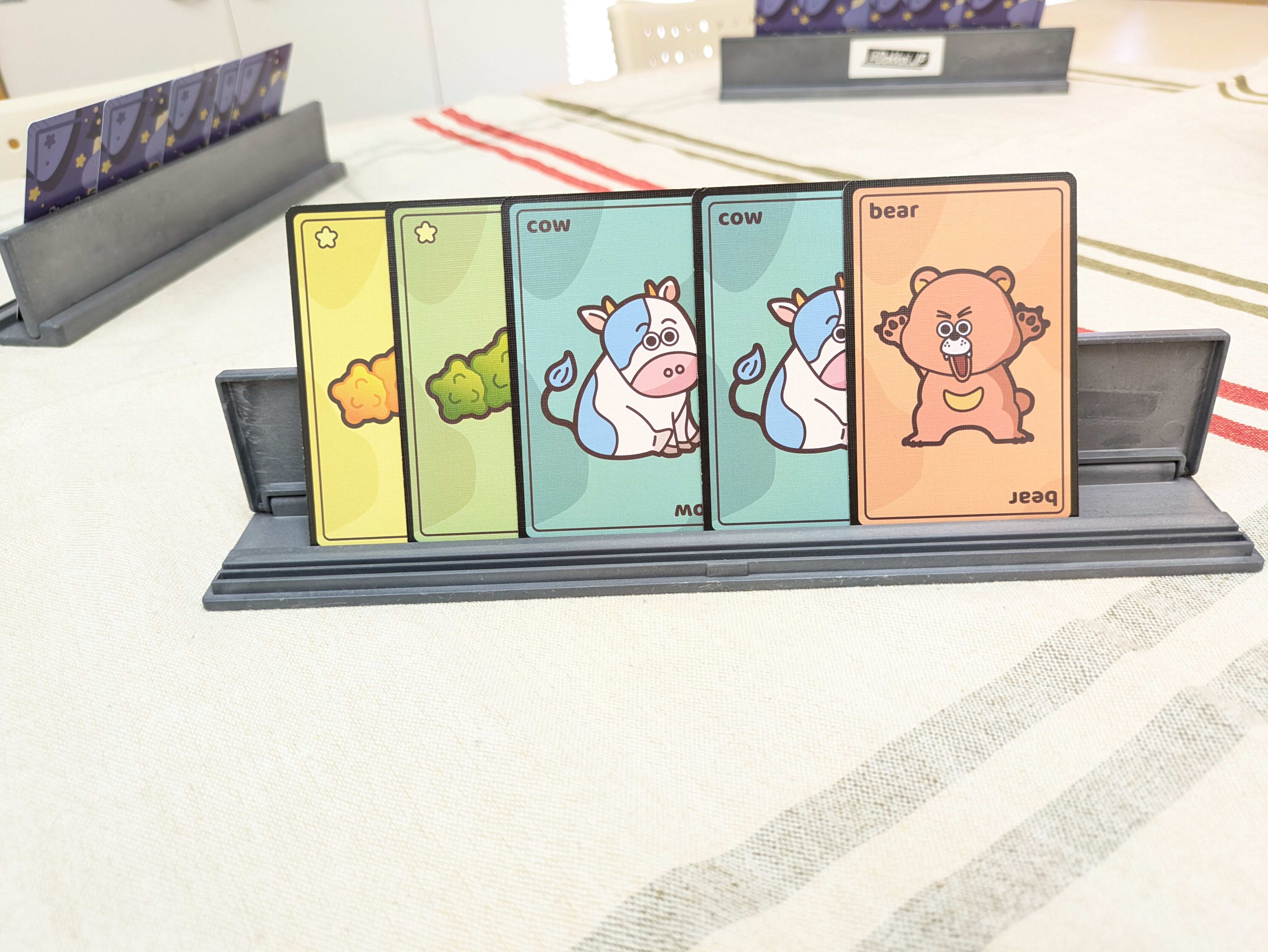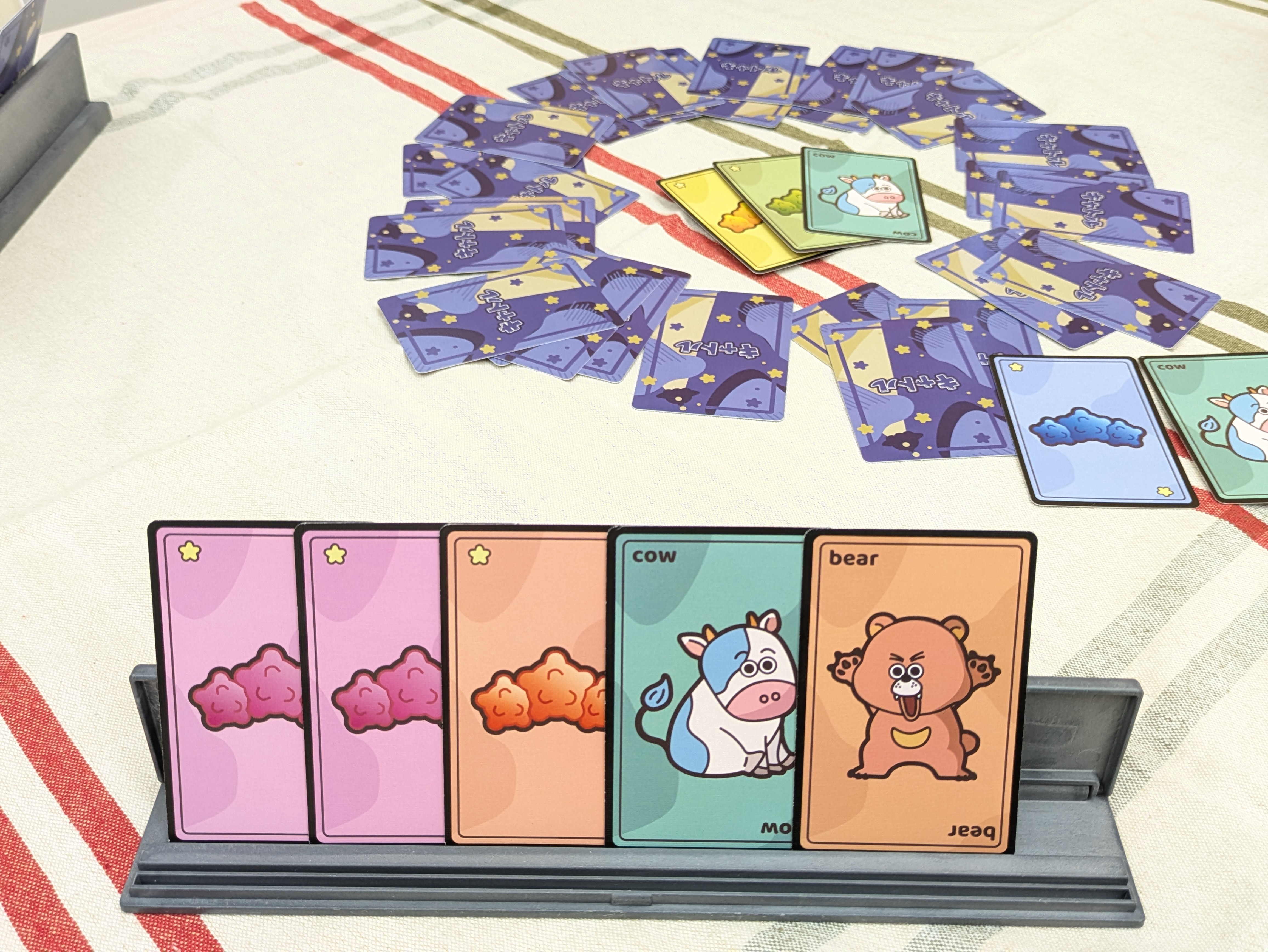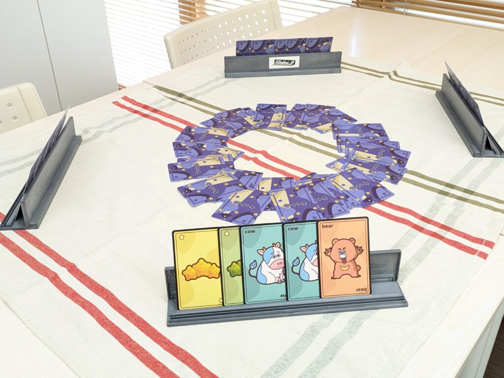 これらのカードを裏向きにしてよく混ぜ、各プレイヤーに5枚ずつ配ります。