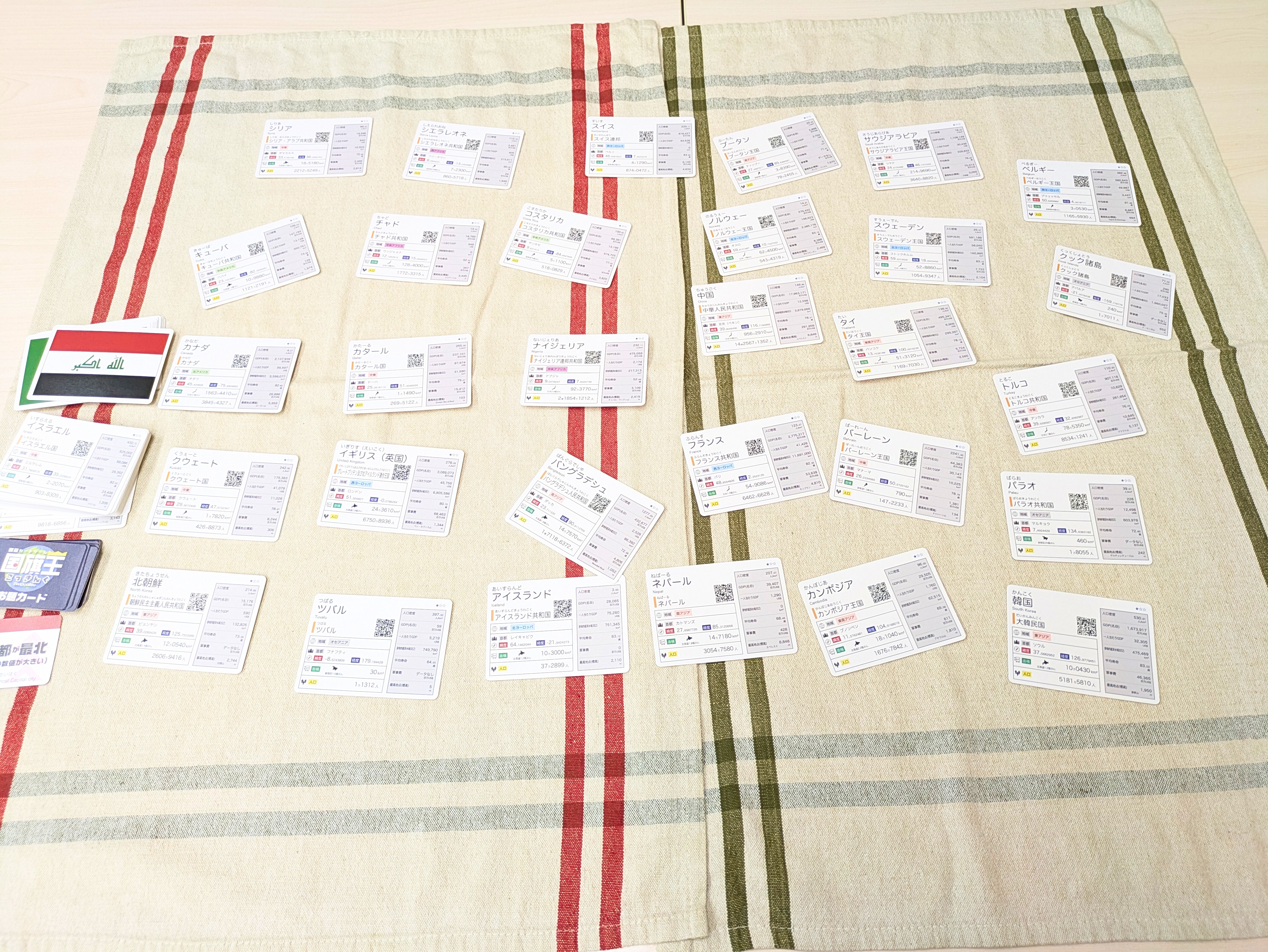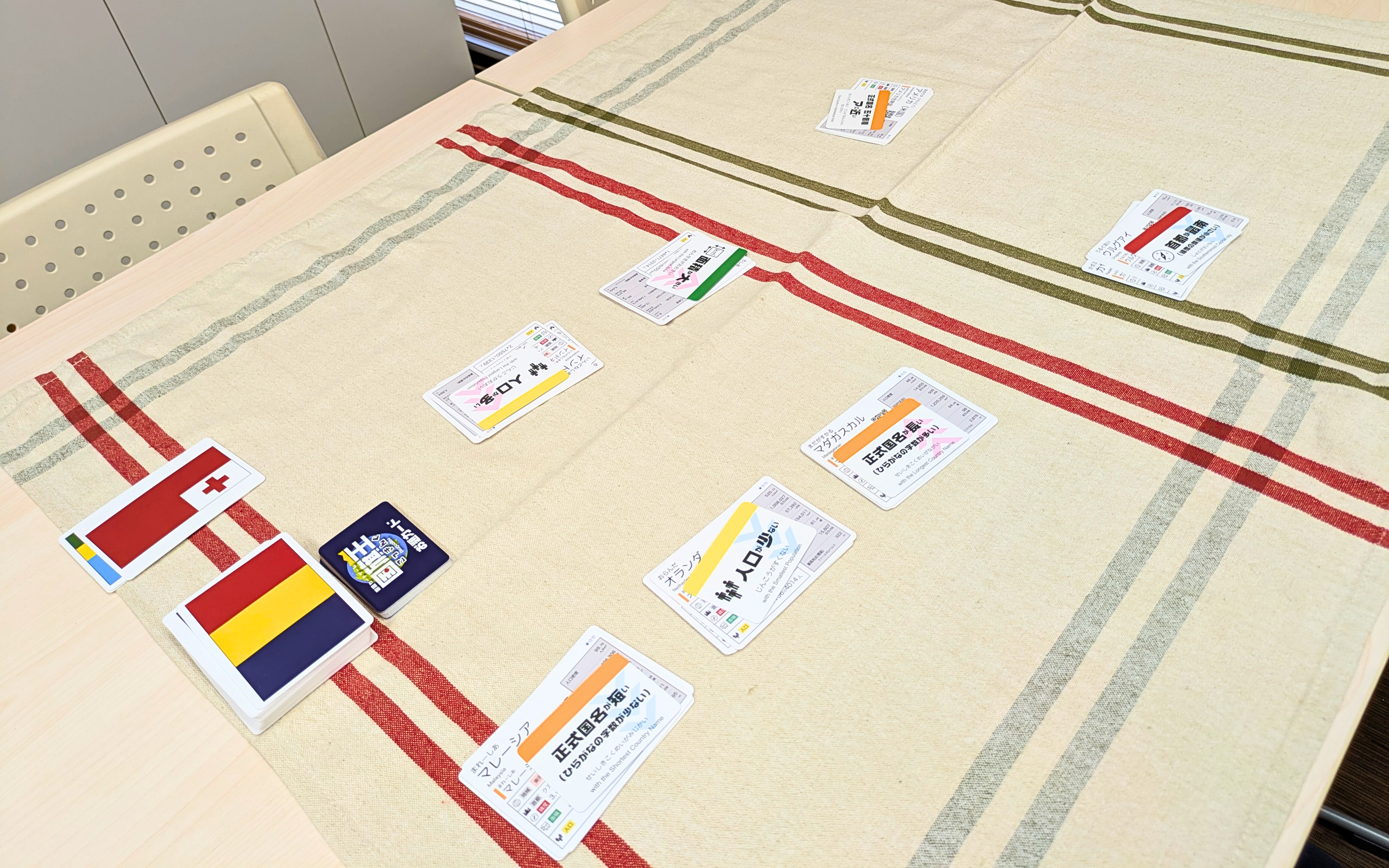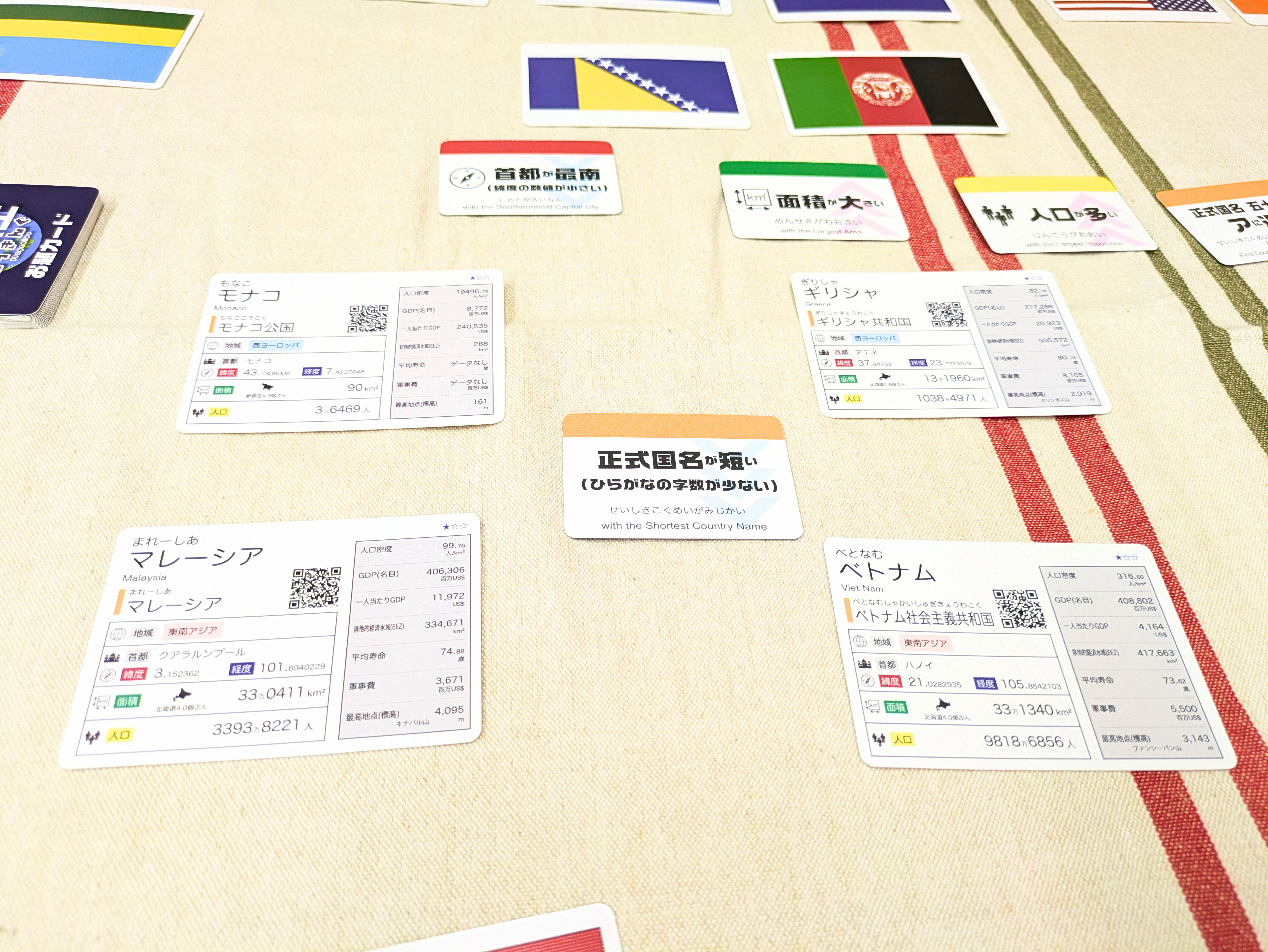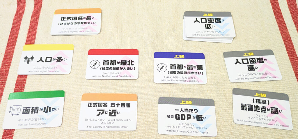 国のデータだけではなく「国旗」のデザインに注目したルールや、協力して遊ぶルールもあって、単純な構造ながら遊びの幅があります。