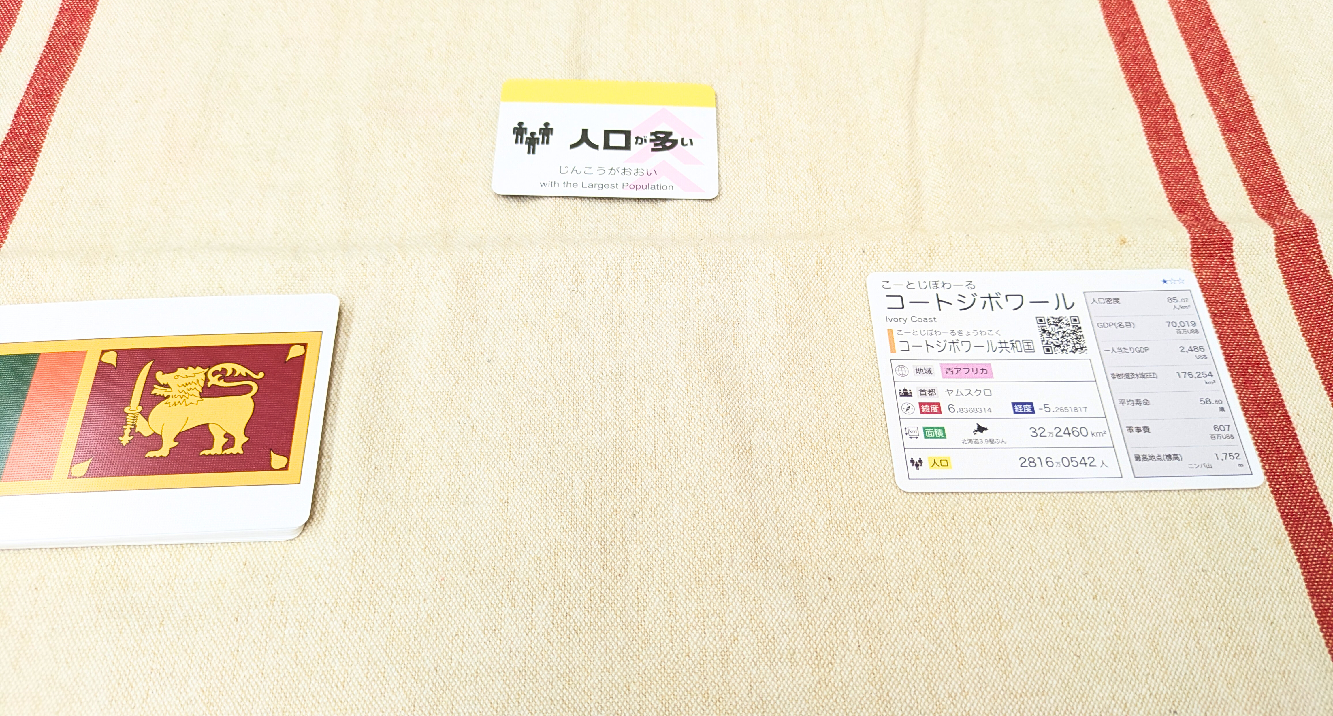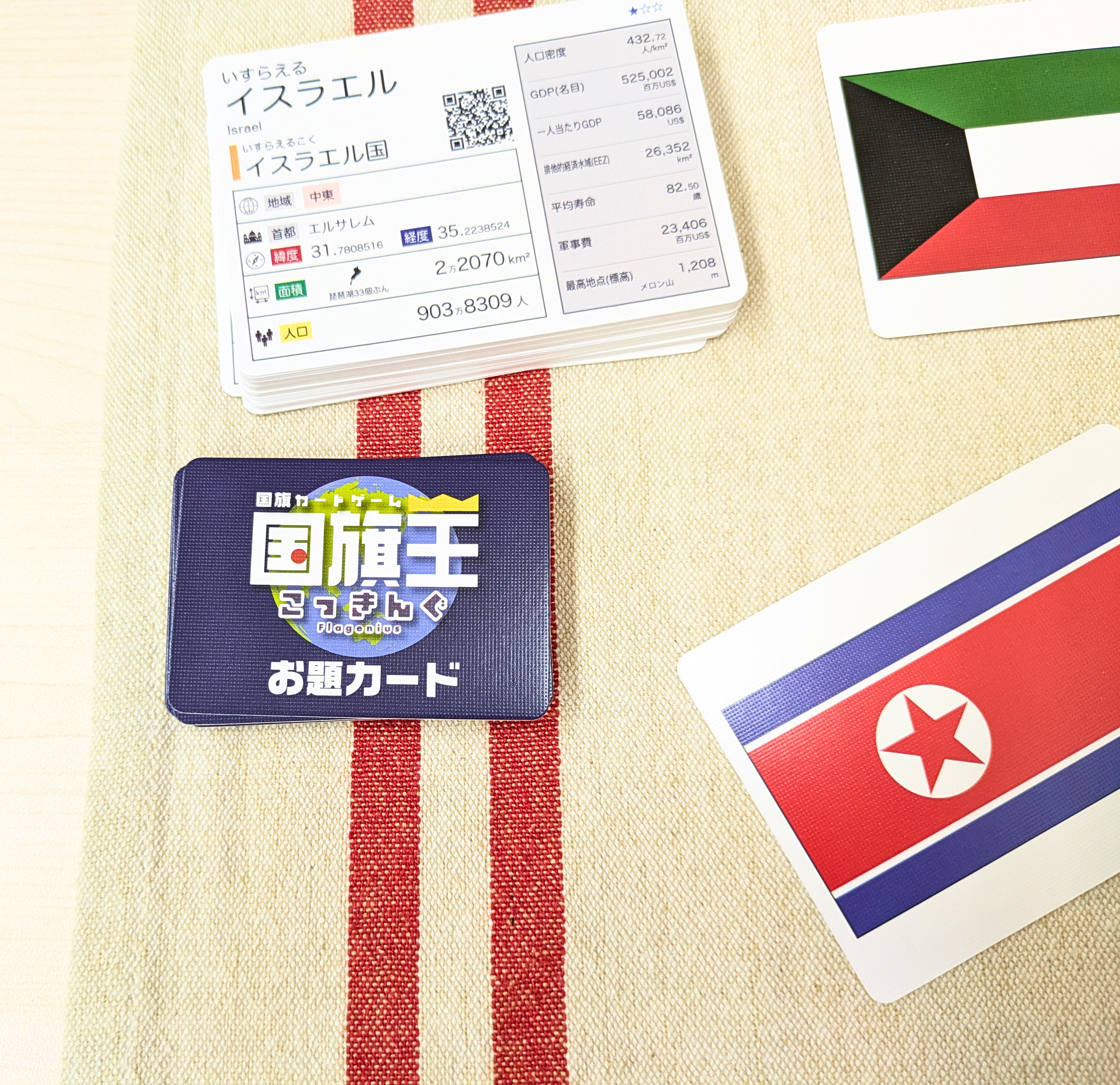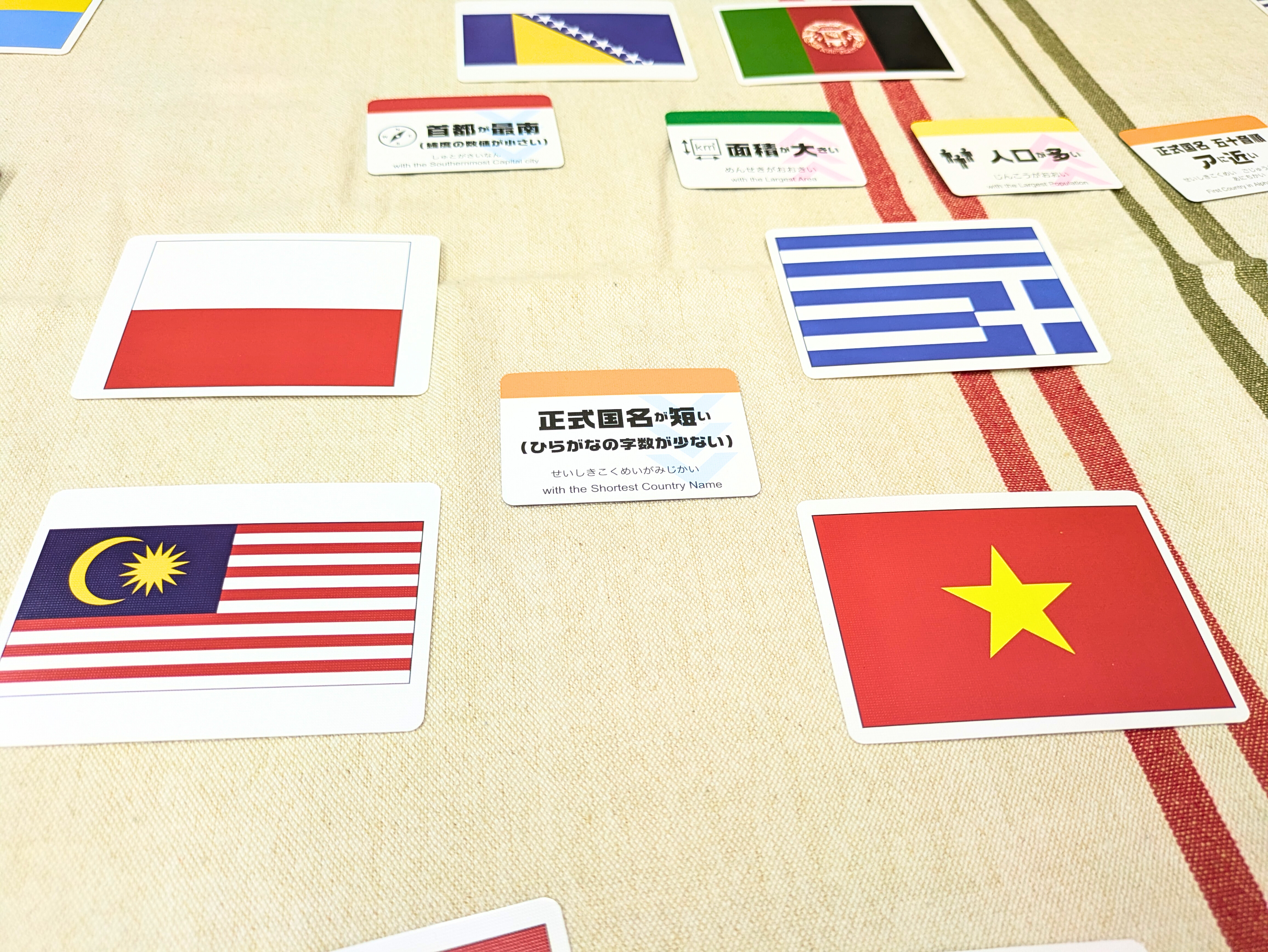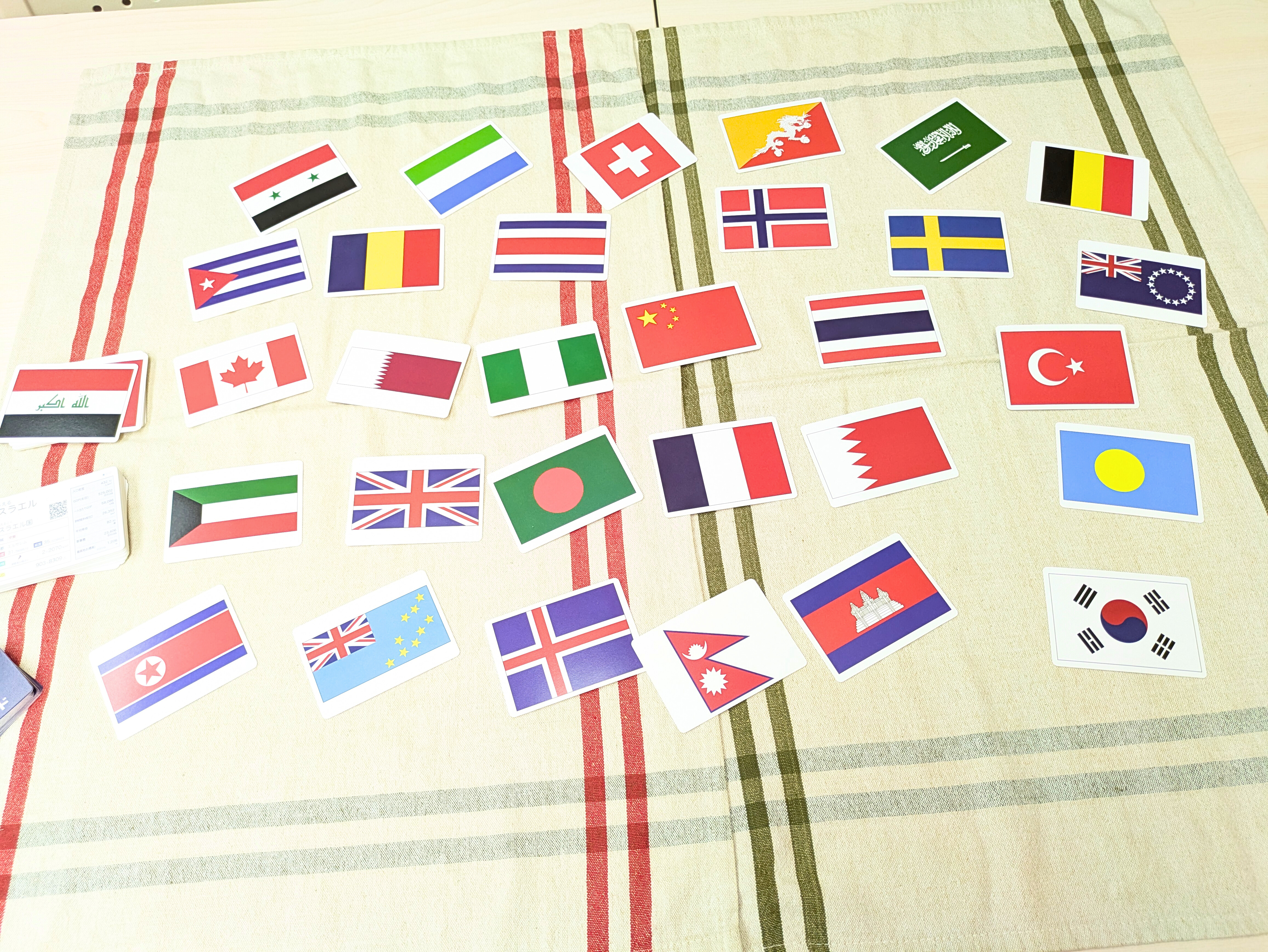国のデータだけではなく「国旗」のデザインに注目したルールや、協力して遊ぶルールもあって、単純な構造ながら遊びの幅があります。