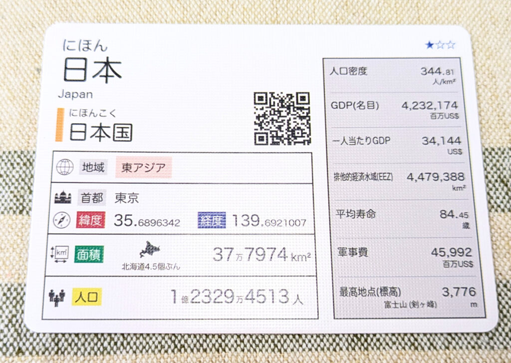 いろんな国に興味を持って、さらにその情報を深堀したりと、世界の国を知るきっかけになるとても素敵なゲームだと思いました。