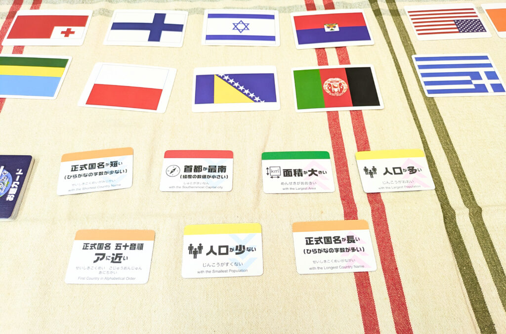 データが書かれた裏面にして置きます。 - ④お題を考慮して国旗カードを並べる