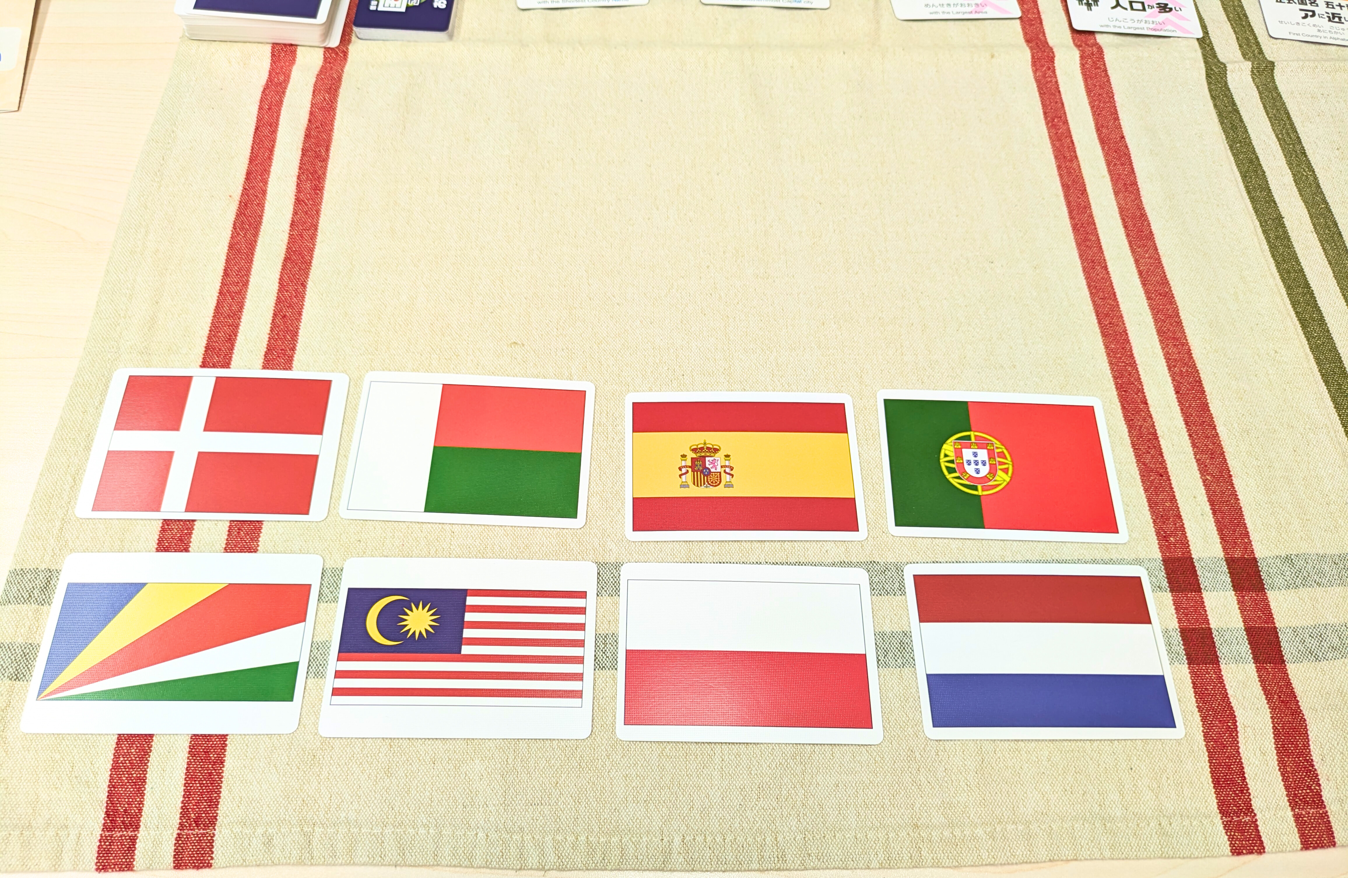 次のお題カードを確認し、前のラウンドで勝ったプレイヤーから順番に国旗カードを出していきます。