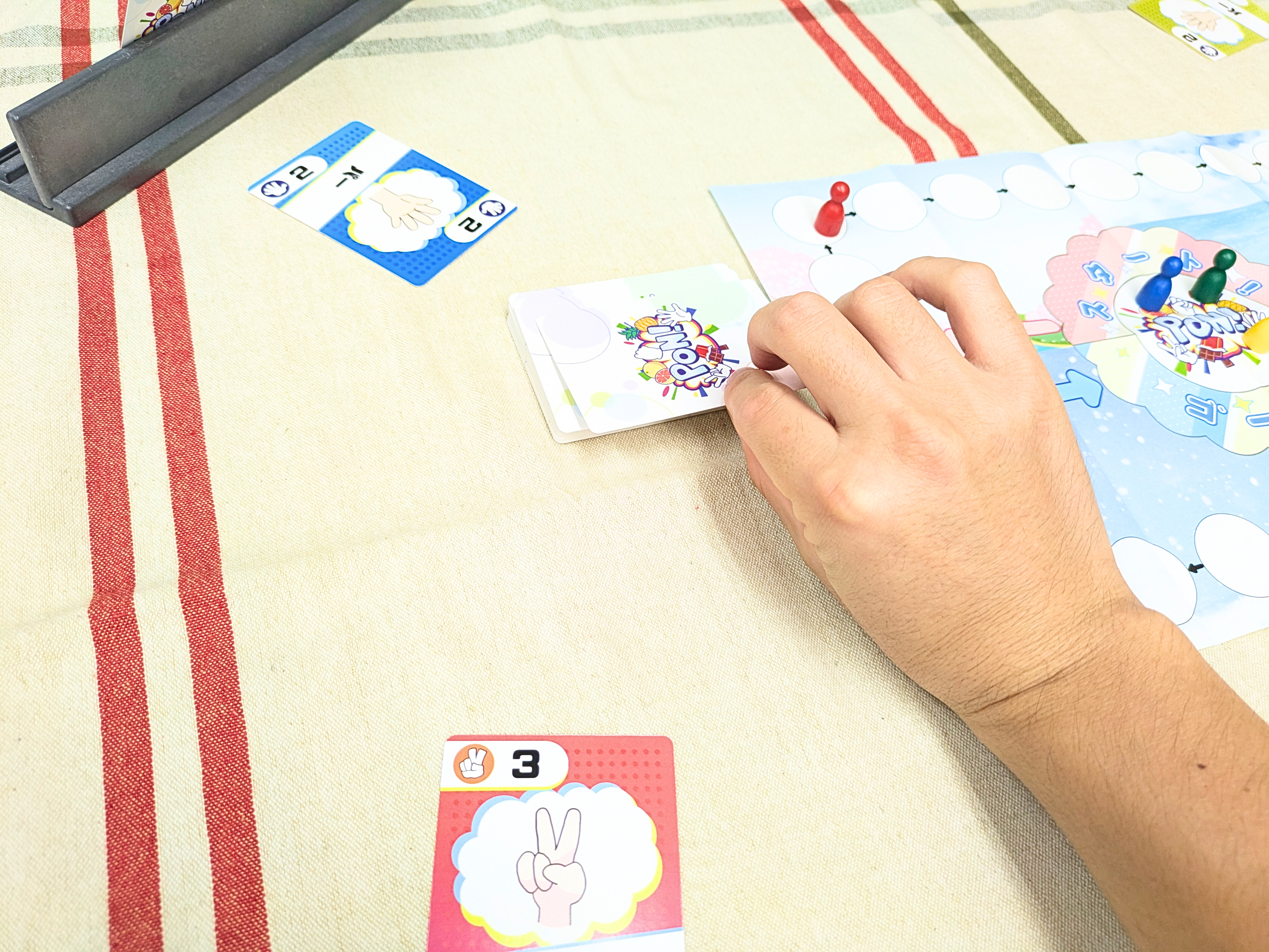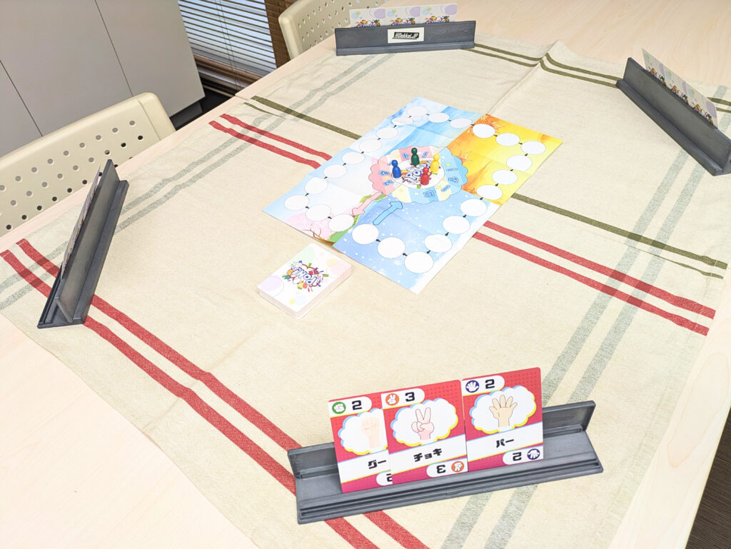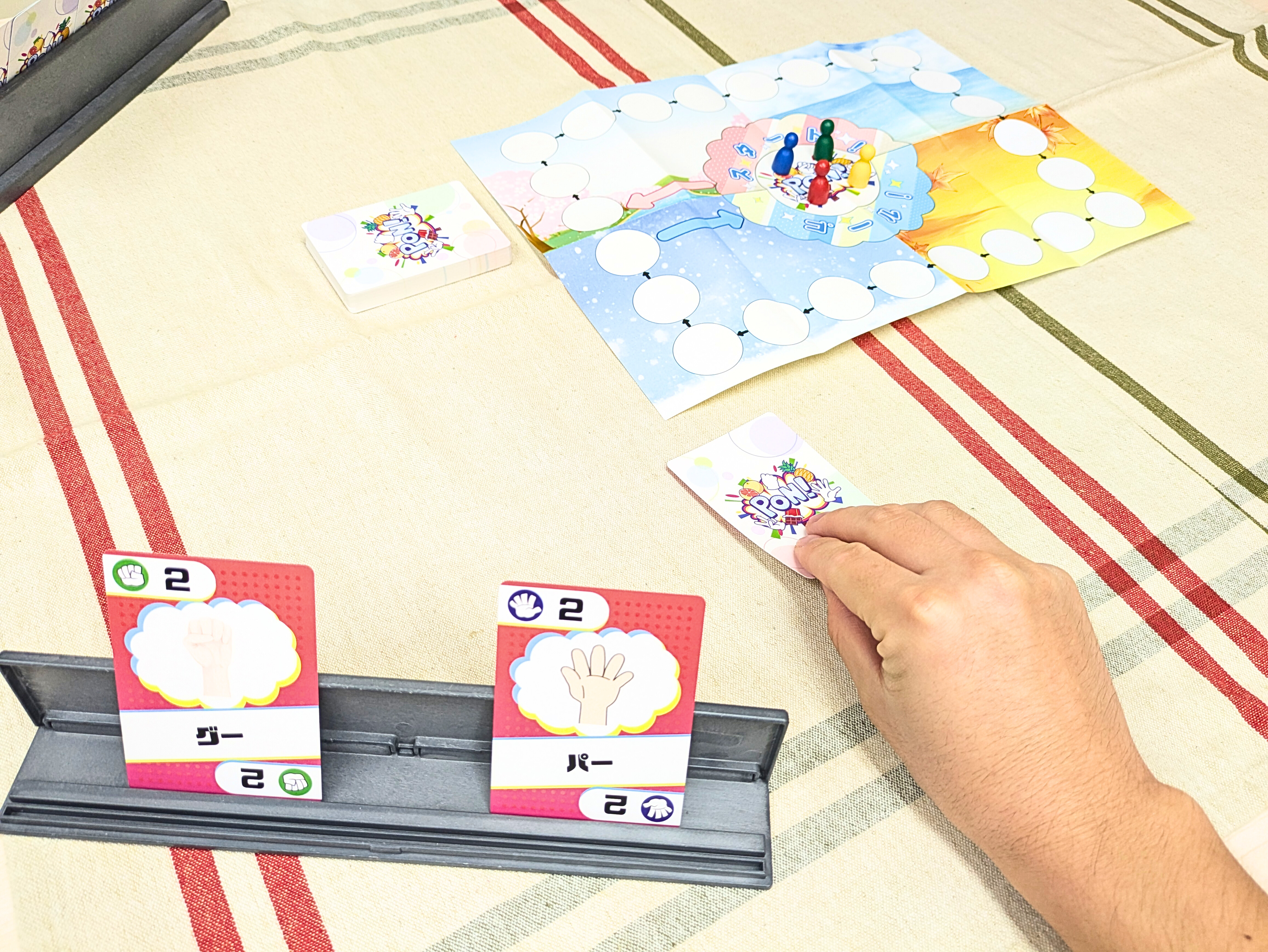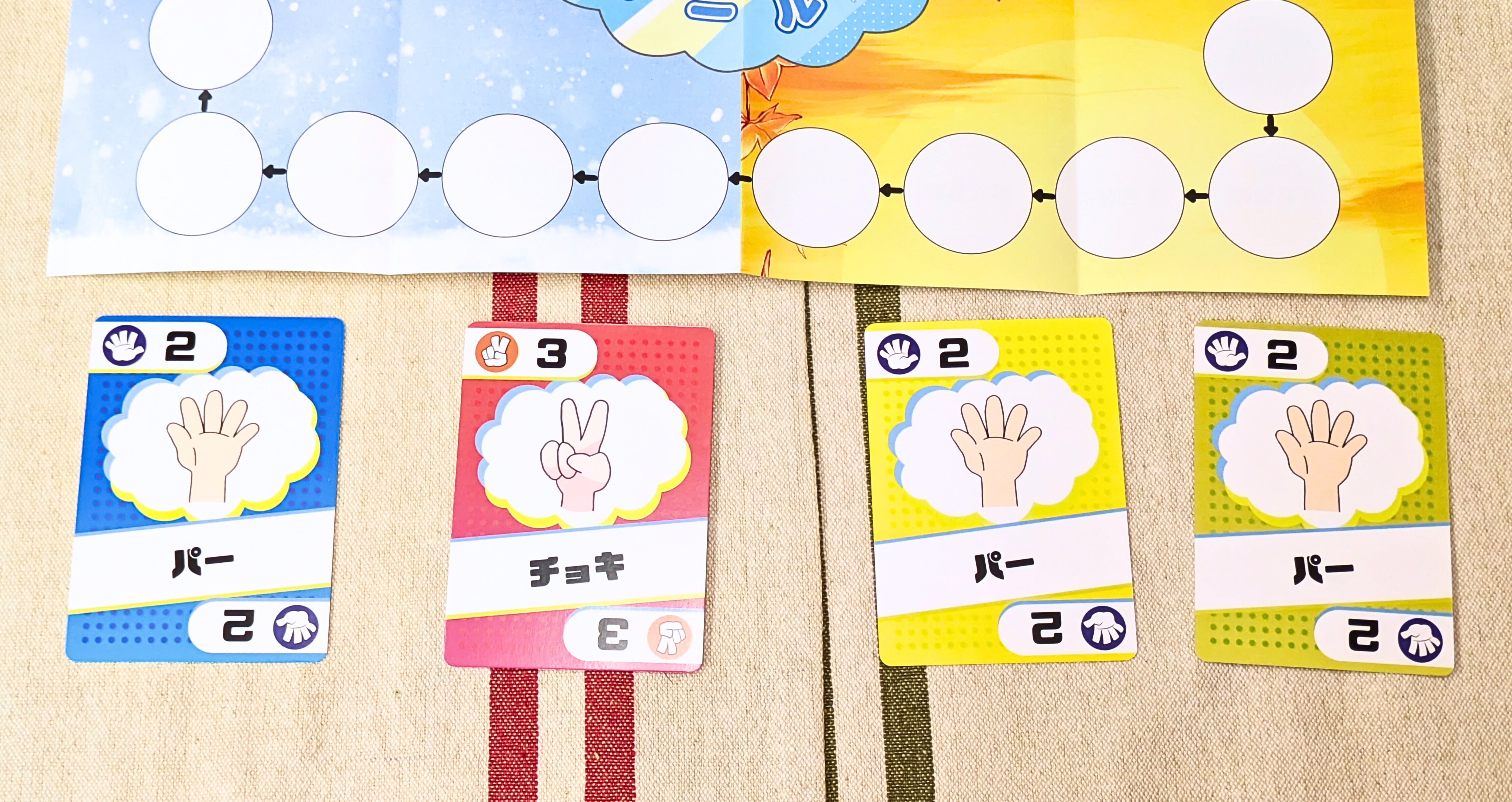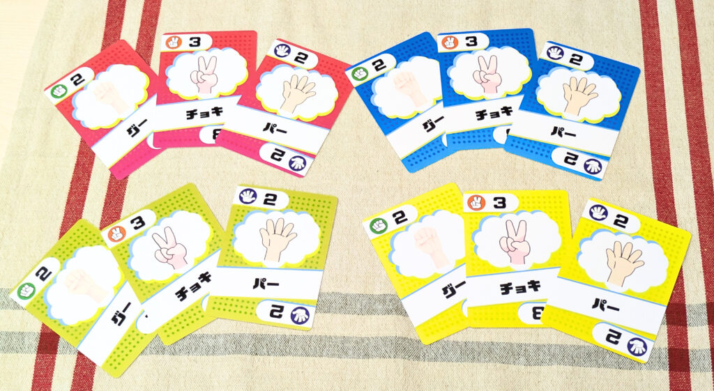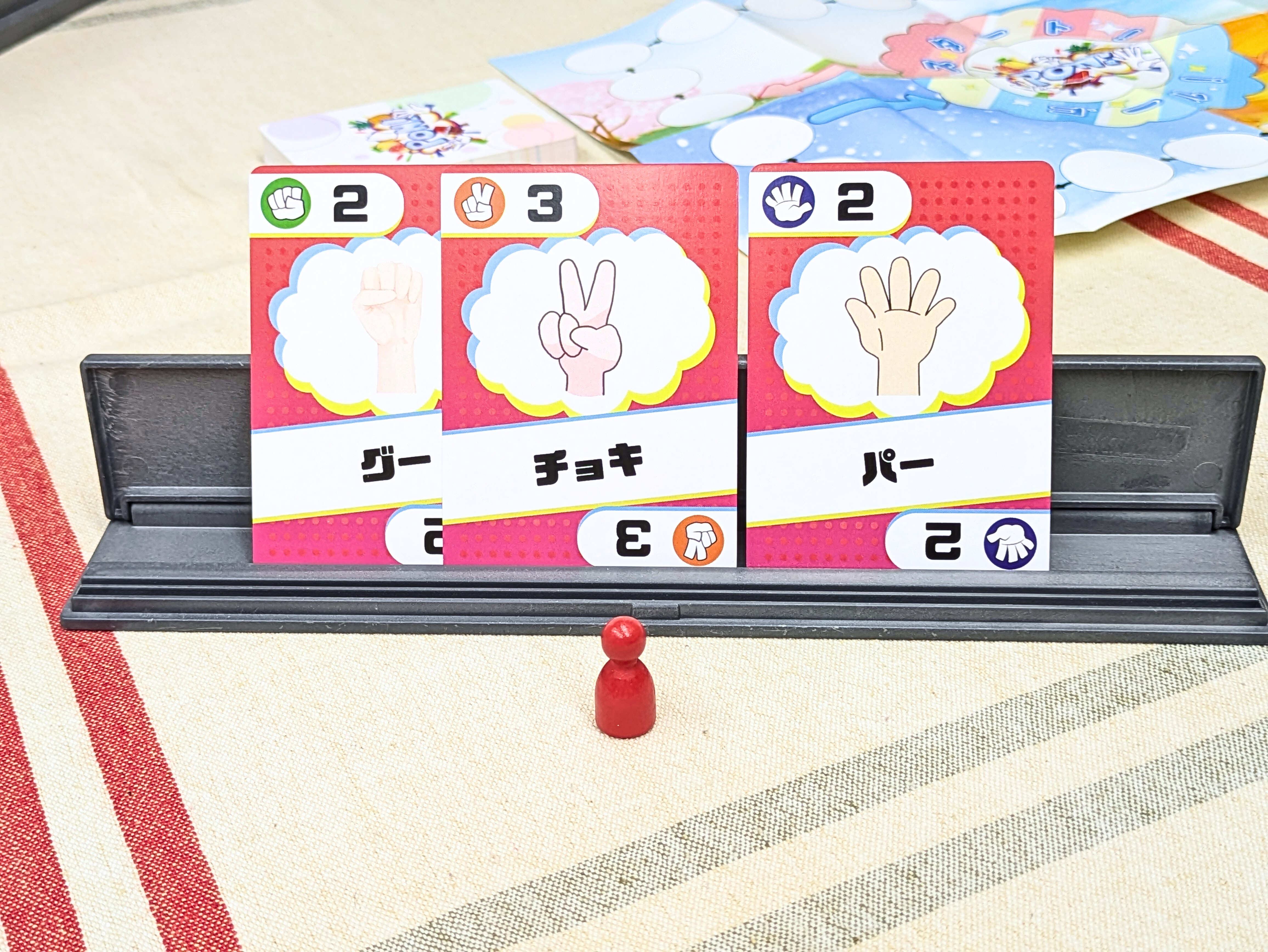 各プレイヤーは、「グー、チョキ、パー」と言葉の描かれた手札からカードを1枚選び、自分の前に裏向きにして置きます。
