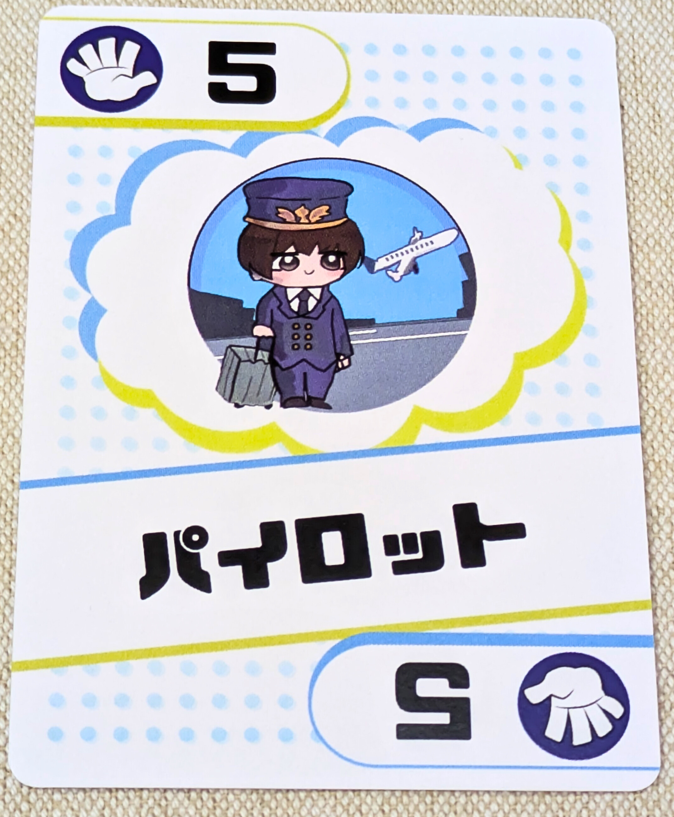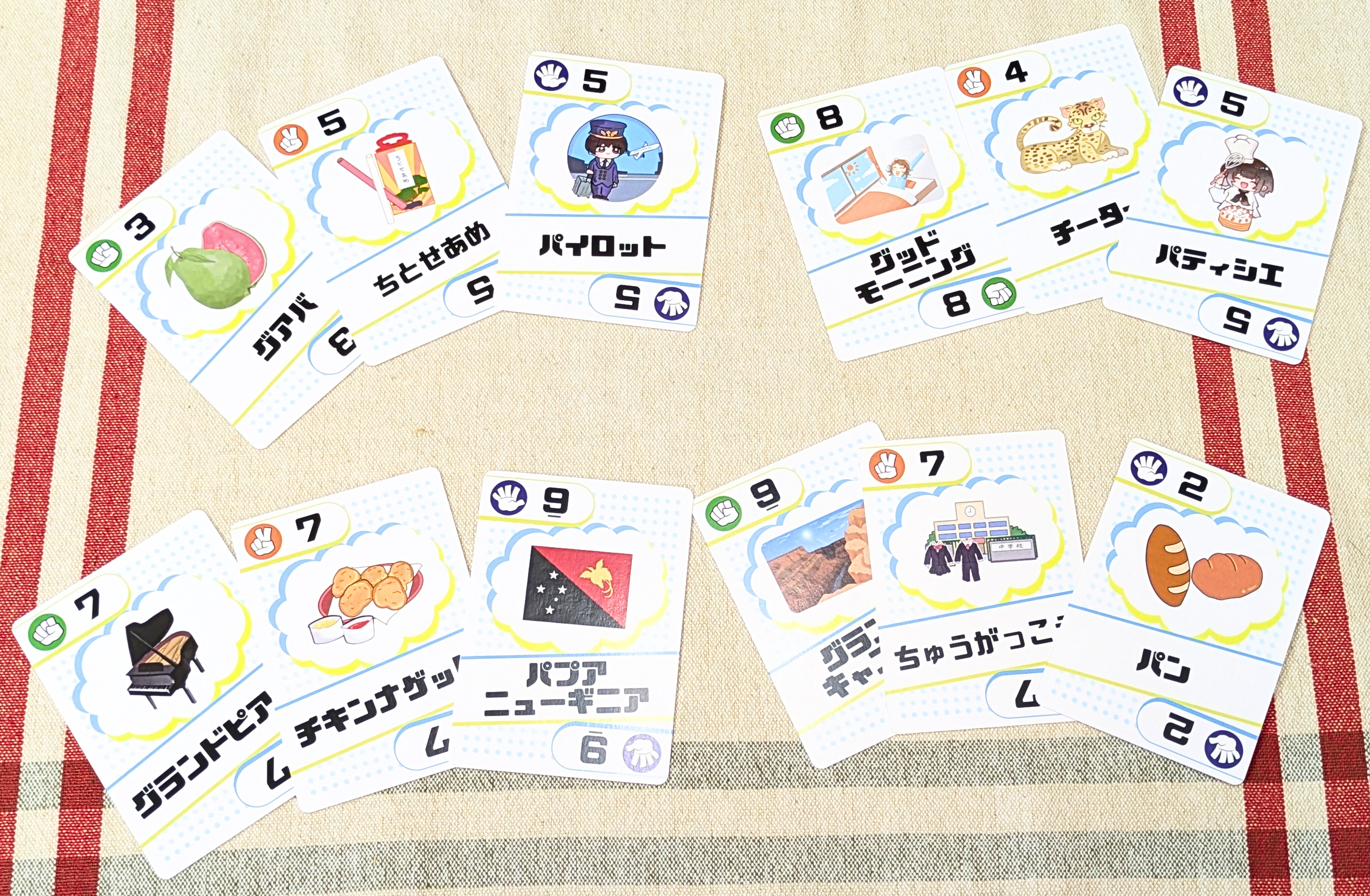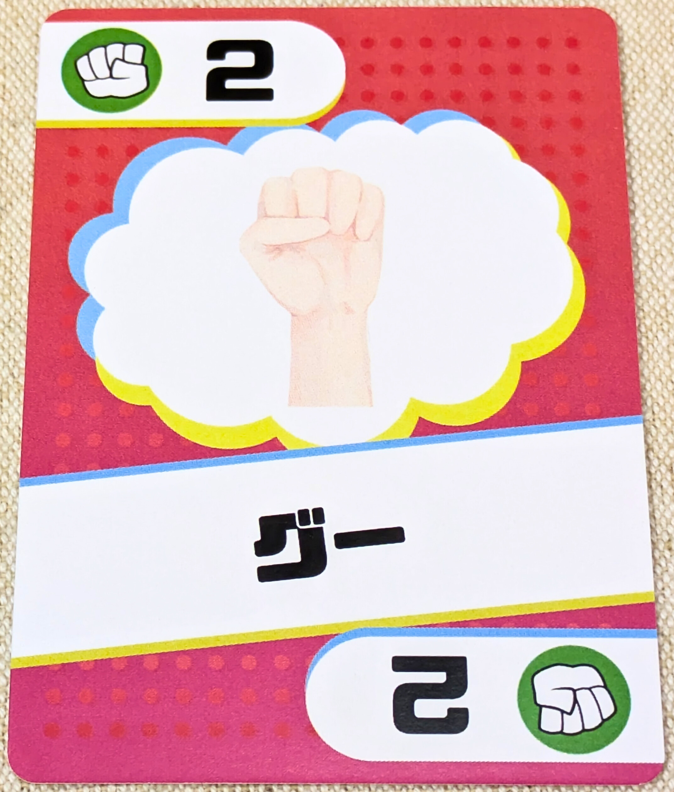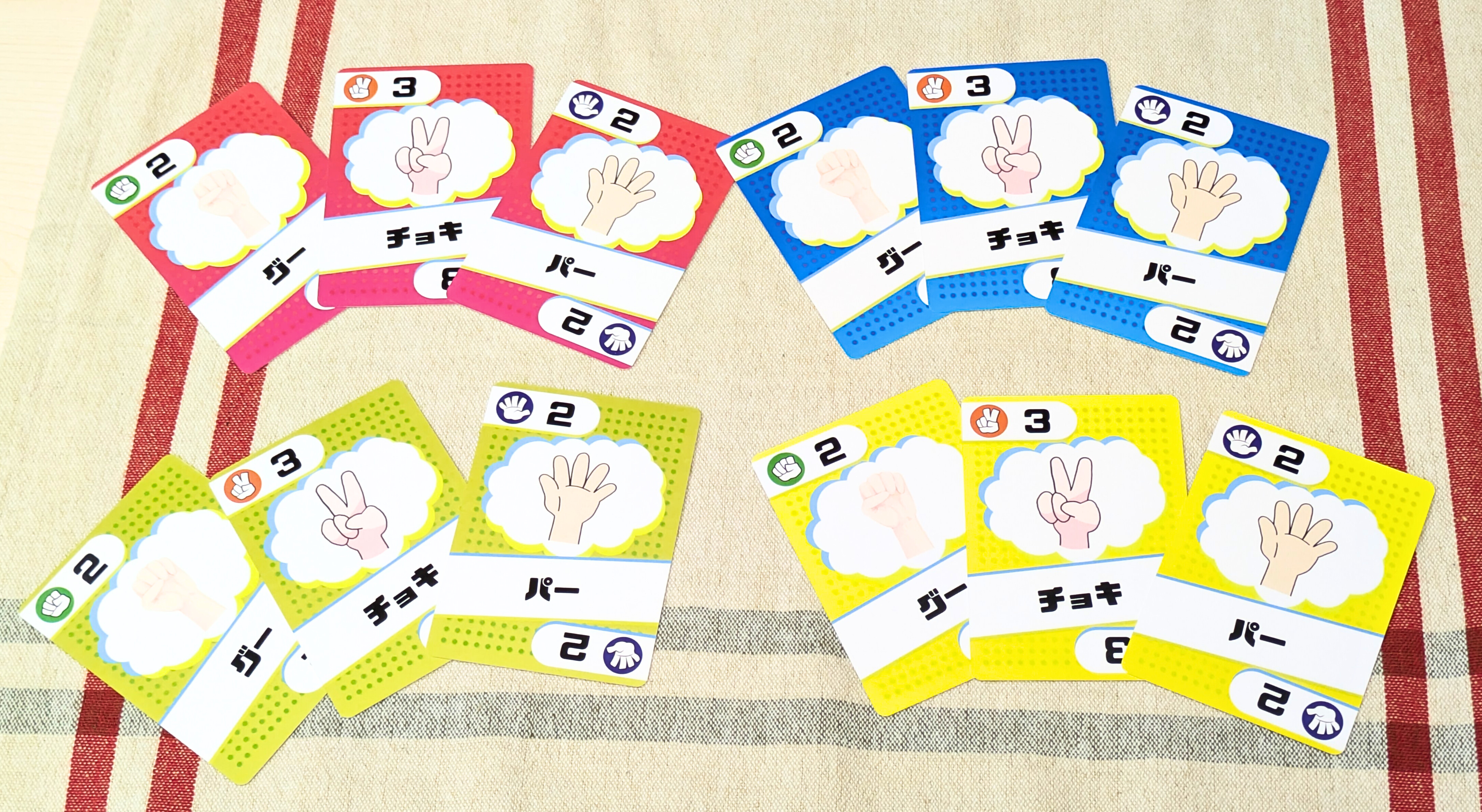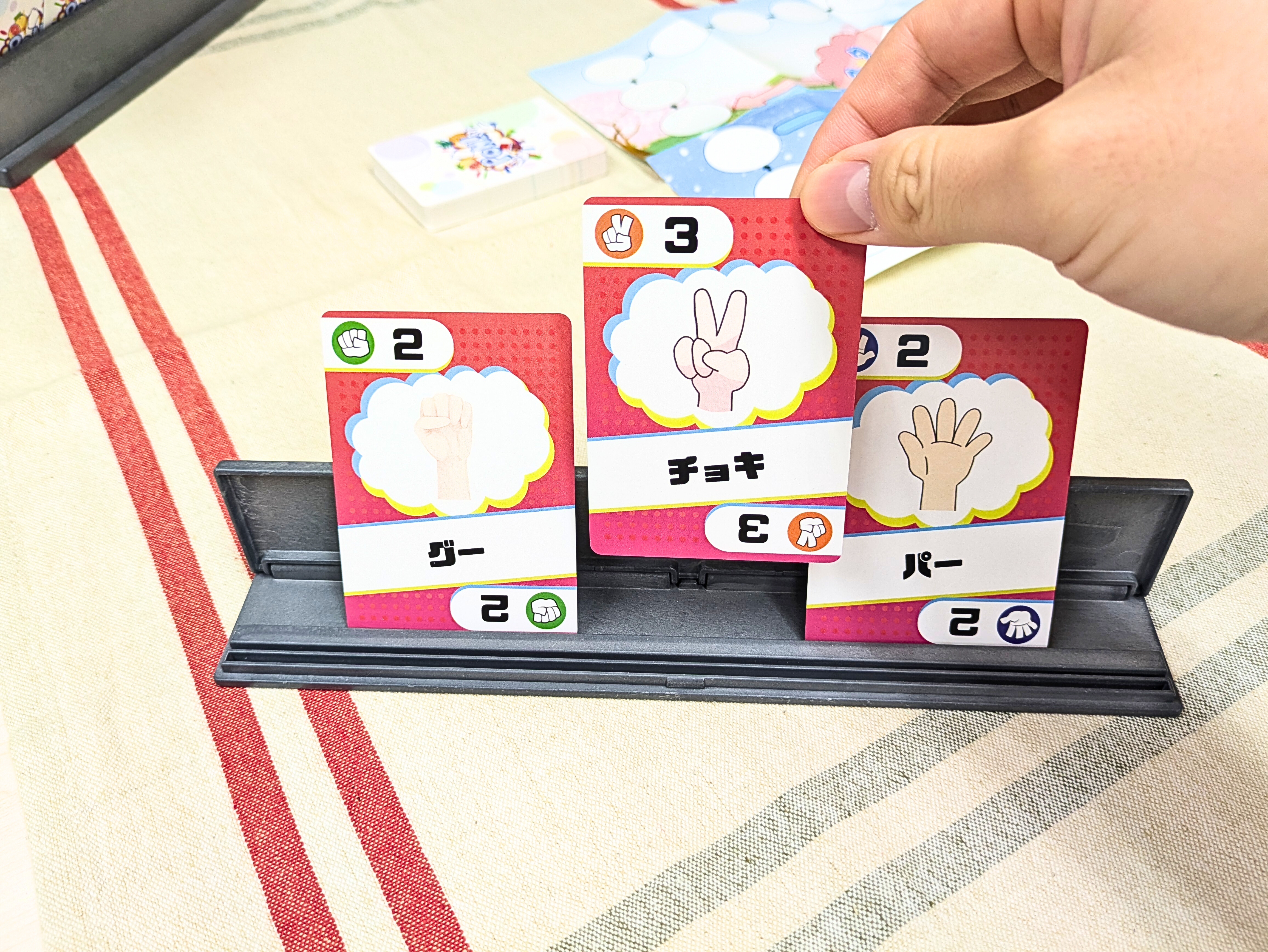 各プレイヤーは、「グー、チョキ、パー」と言葉の描かれた手札からカードを1枚選び、自分の前に裏向きにして置きます。