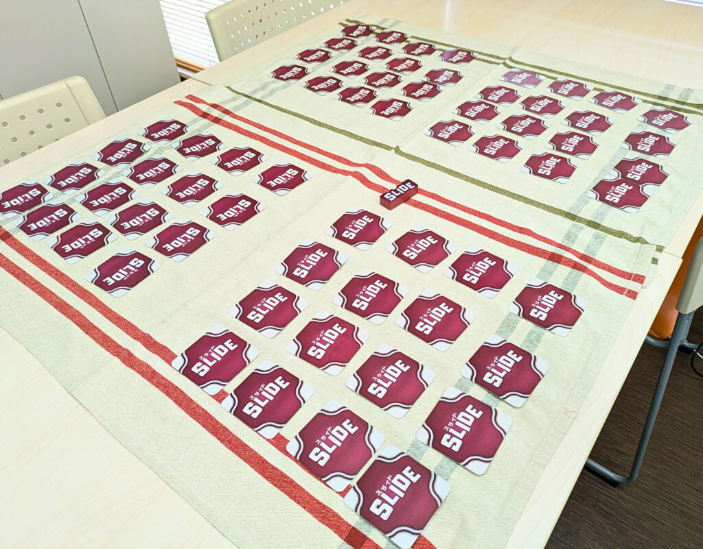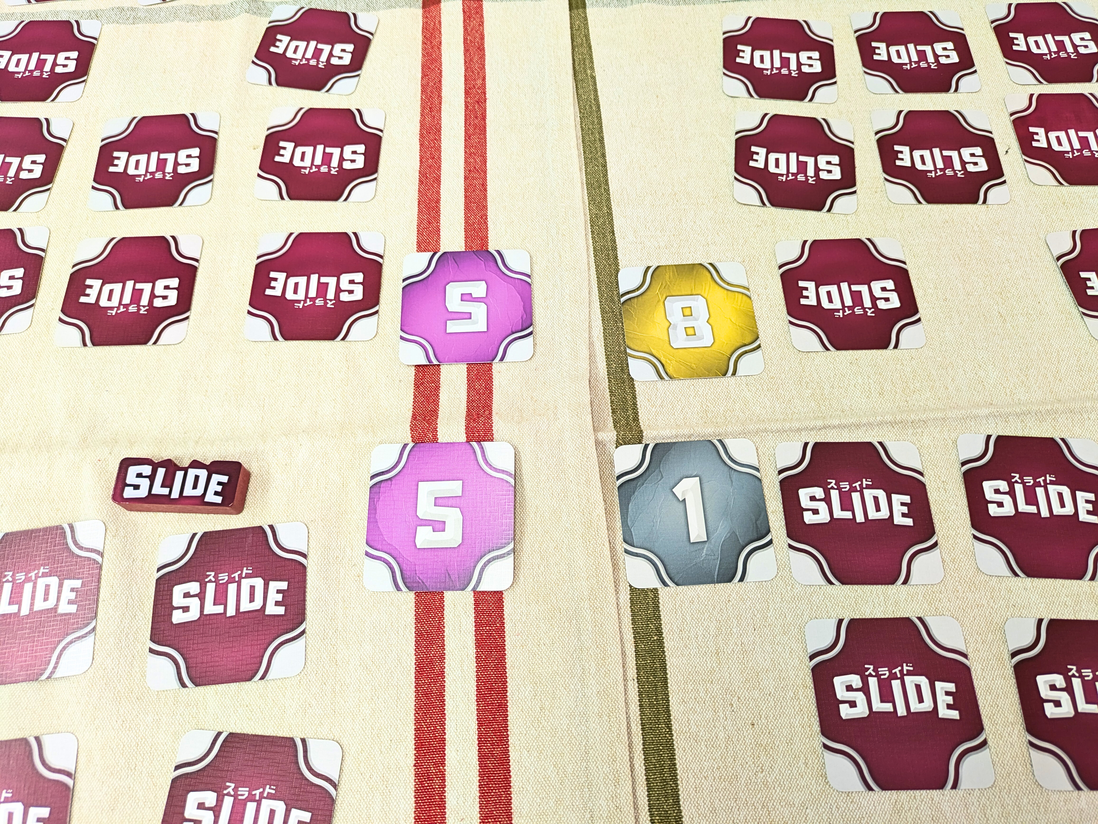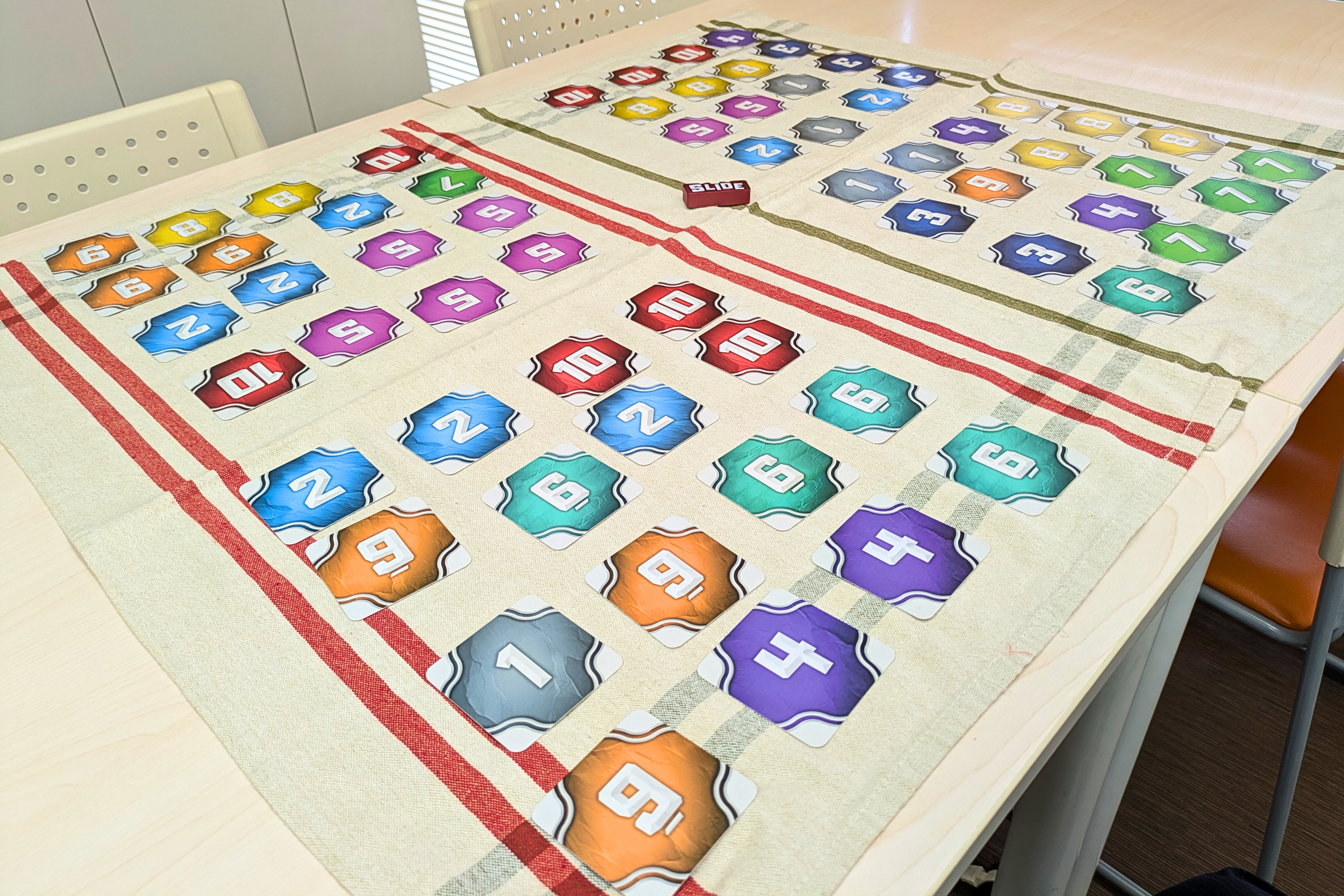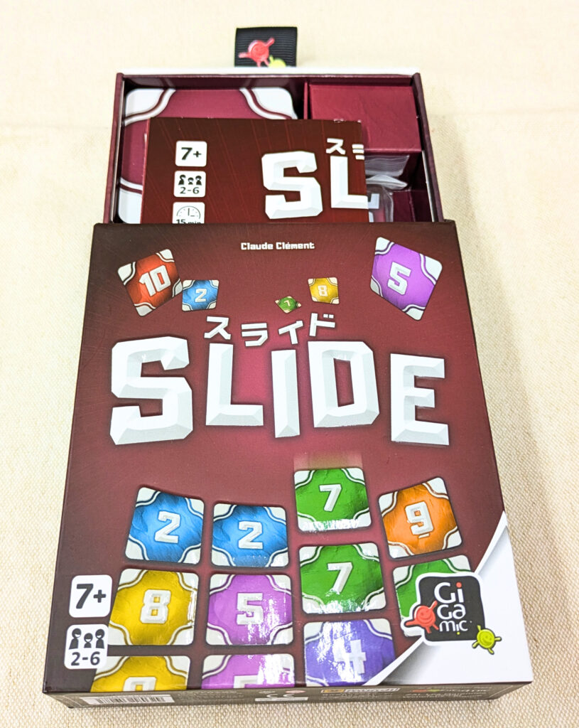 スライドは、できるだけ同じ数字のカードを隣接させて並べて失点を抑えるセットコレクションゲームです。