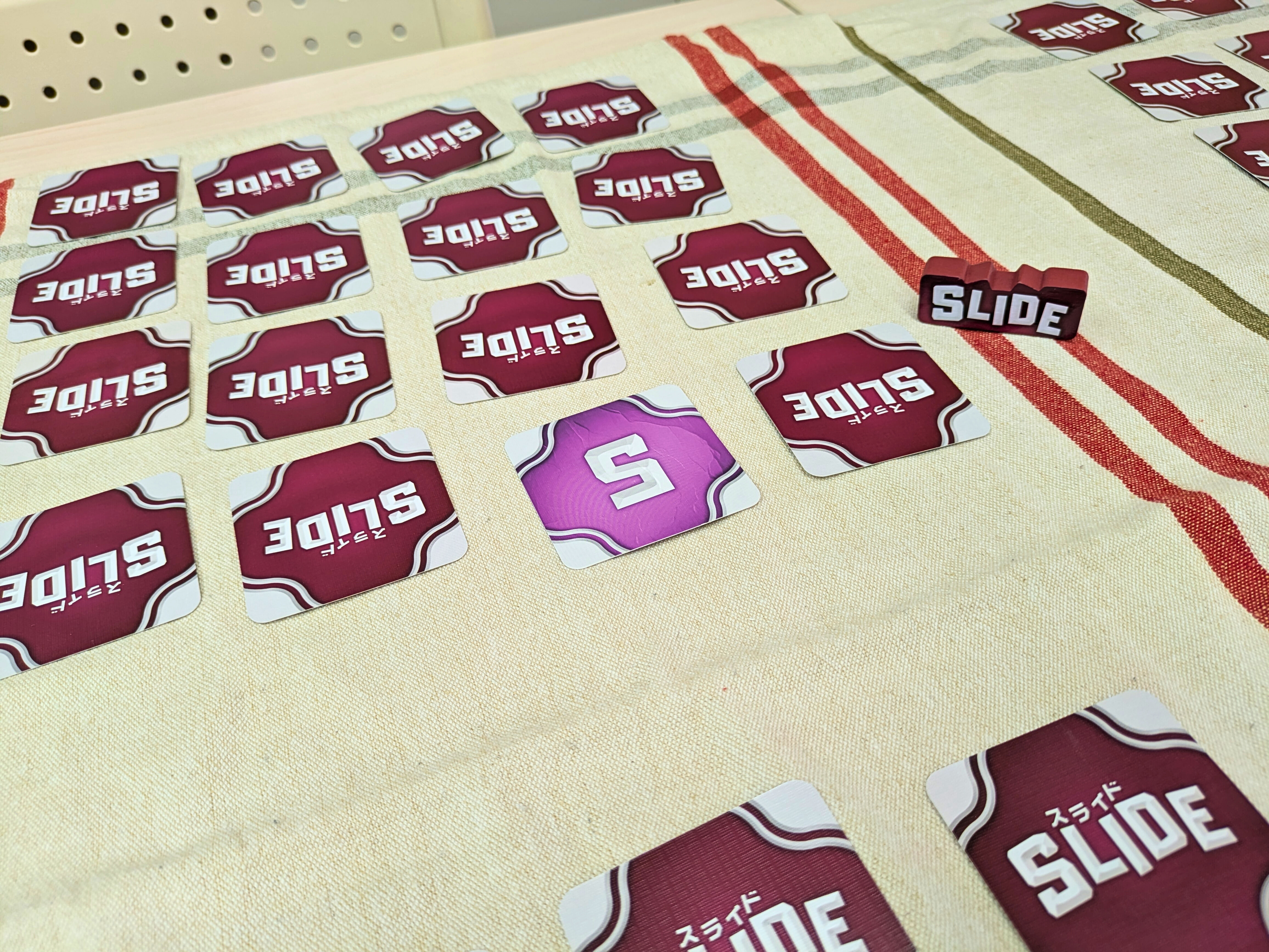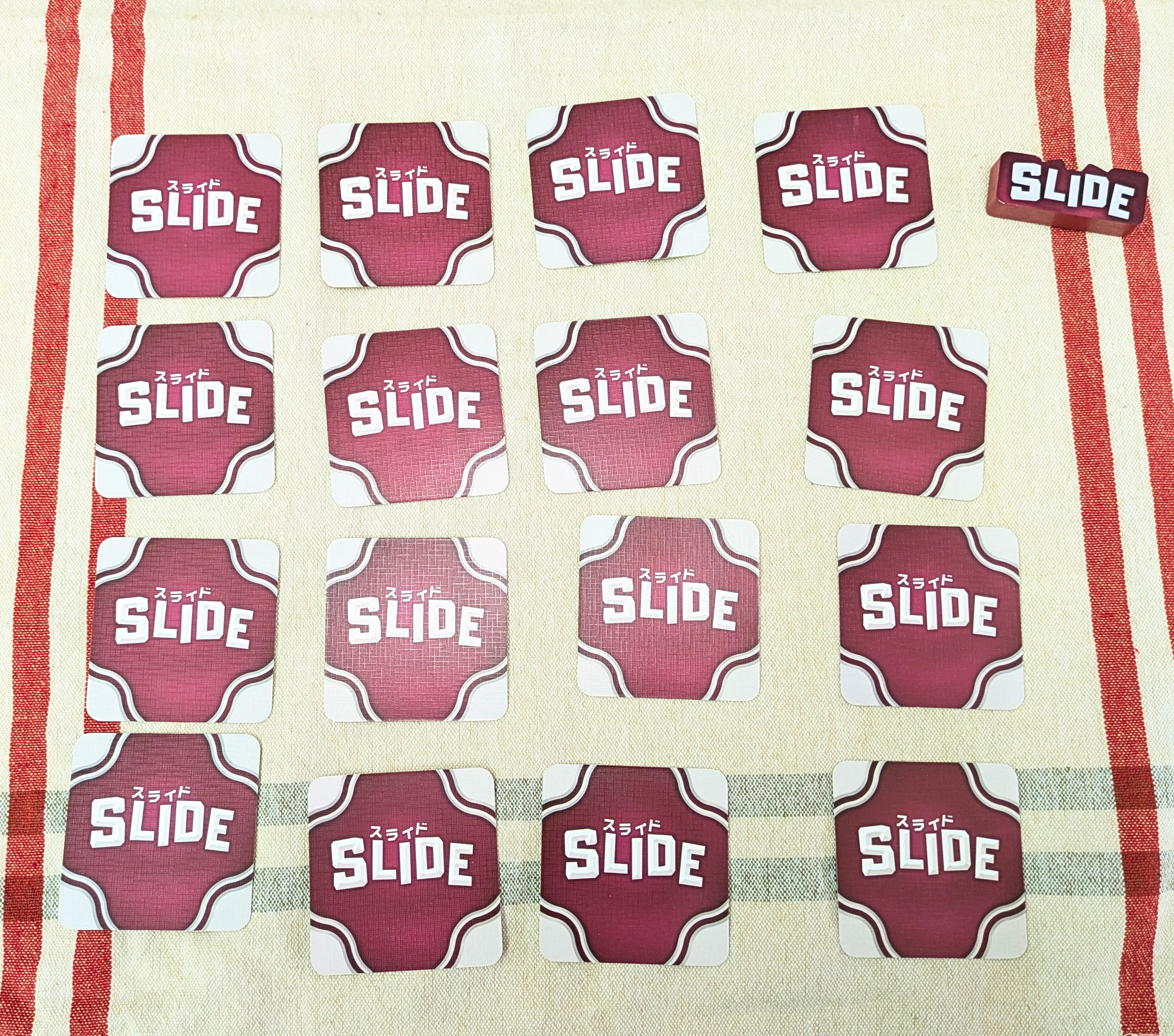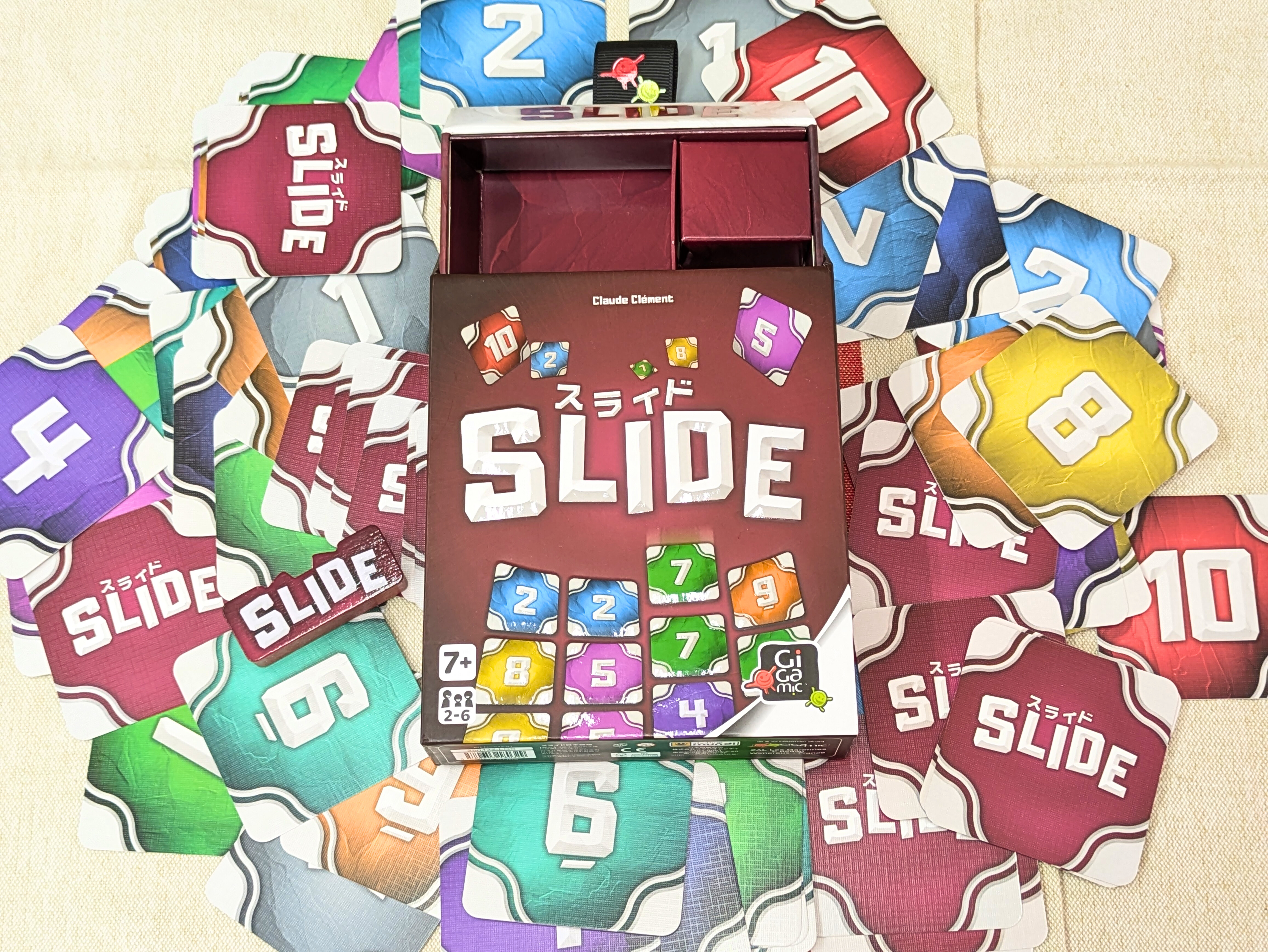 スライドは、できるだけ同じ数字のカードを隣接させて並べて失点を抑えるセットコレクションゲームです。