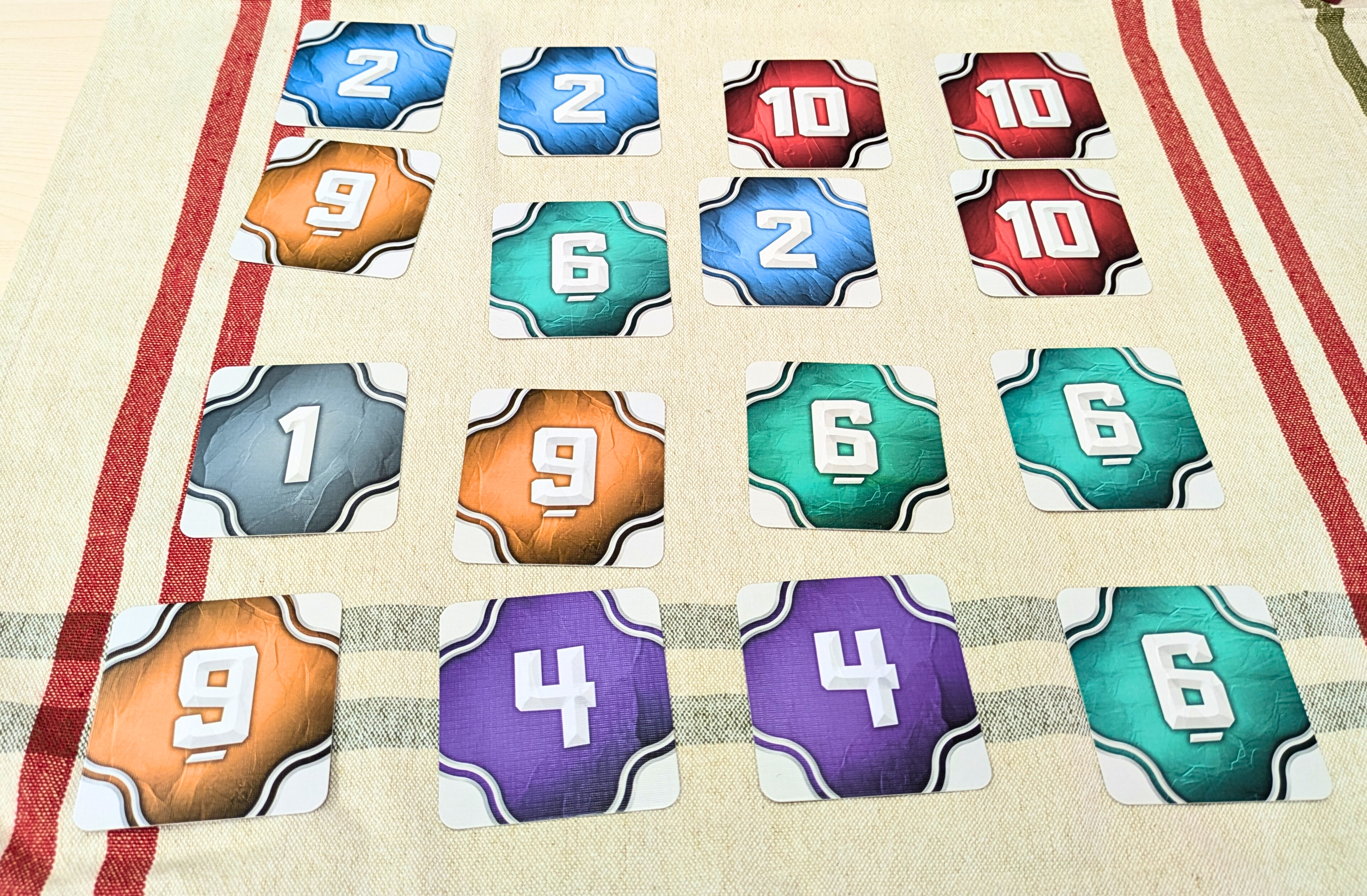 1~10までの10種類10枚ずつの数字カードを裏向きにしてよく混ぜます。その後、各プレイヤーに16枚ずつ配ります。残ったカードは、箱に戻します。